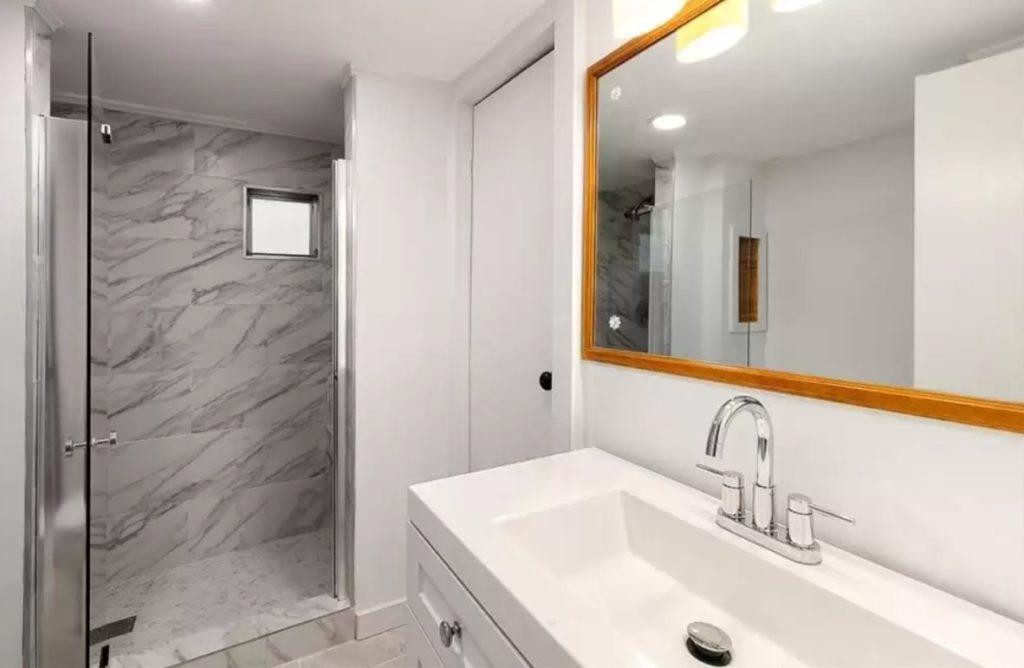 The bathrooms both have nice walk-in showers and a soft grey marble feel to them.
