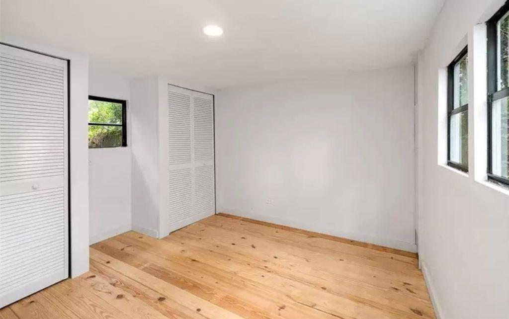 Bedrooms in vintage mobile homes are never very roomy. However, this home does include double closets and a nice space between them for a chest.