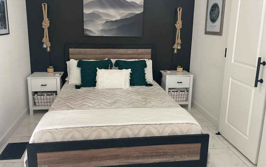 The bedrooms also utilize space-saving designs and decor tips. The use of barn doors throughout the home adds extra space while adding to the charm of the 1983 single wide. The furniture choices also keep the rooms from feeling overwhelmed but still give the farmhouse look the owners were going for. We also love the accent wall color, adding a dramatic focal point for the small space.