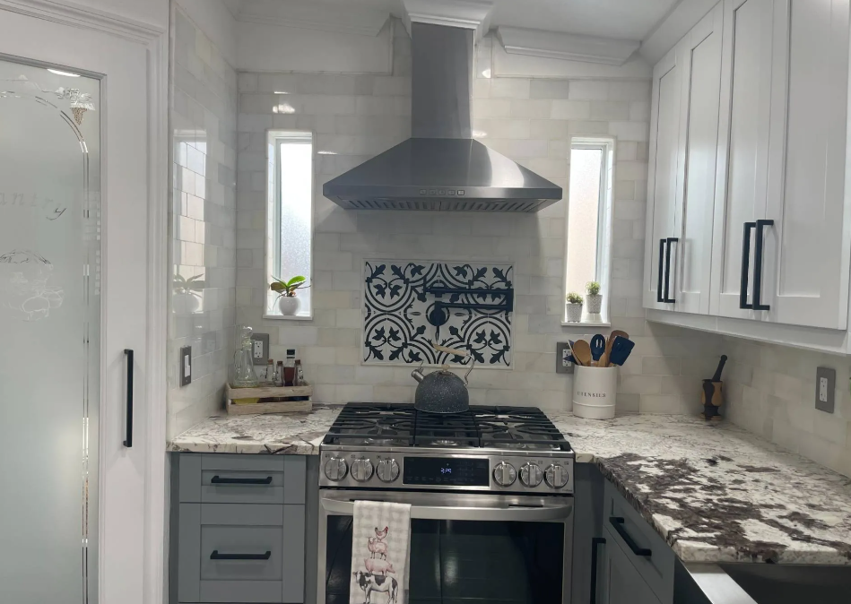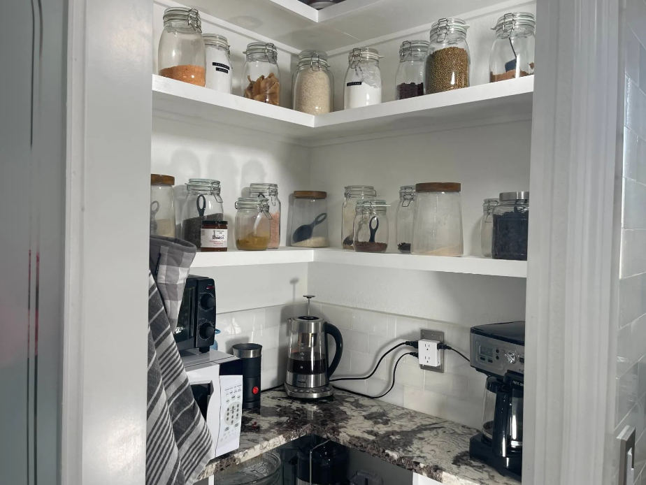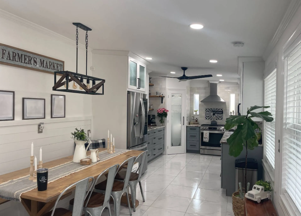 The kitchen also offers many decor and design tips to keep in mind when remodeling your mobile home. The subway tile backsplash and the modern countertop design add a contemporary look to the farmhouse vibe. Also, using the corner pantry with shelves large enough to hold the small appliances keeps the kitchen looking uncluttered.