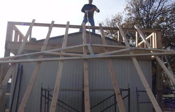 Once the trusses arrived it was time to get them on the roof. Since there were only two people the homeowner used a slide and hoist system to get the trusses up safely: