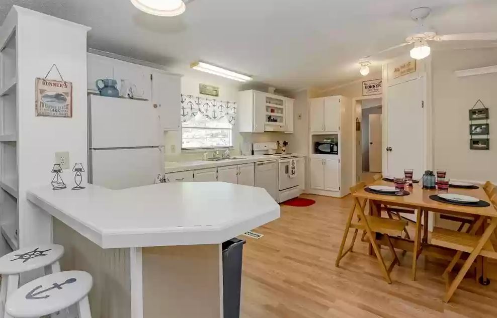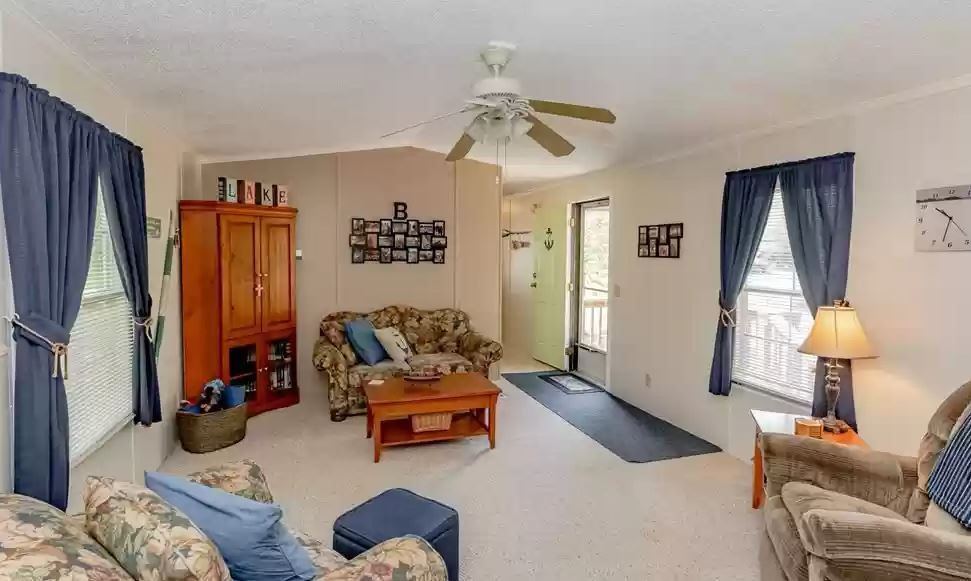 Our final home is a 1992 single-wide listed for $99,980 set up in a lake community and it even comes furnished! The home looks to have updated flooring and fresh paint throughout and is furnished with a nice lake life feel.