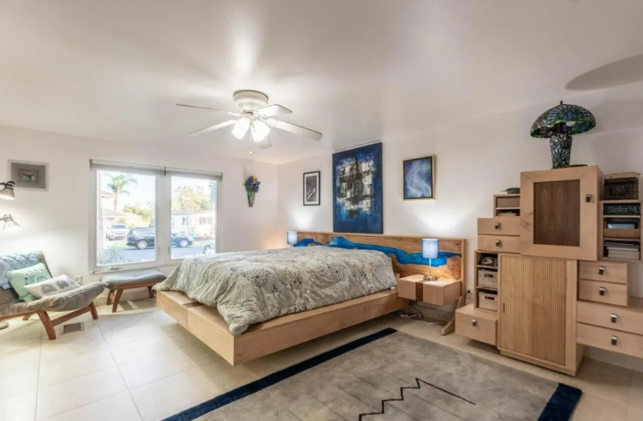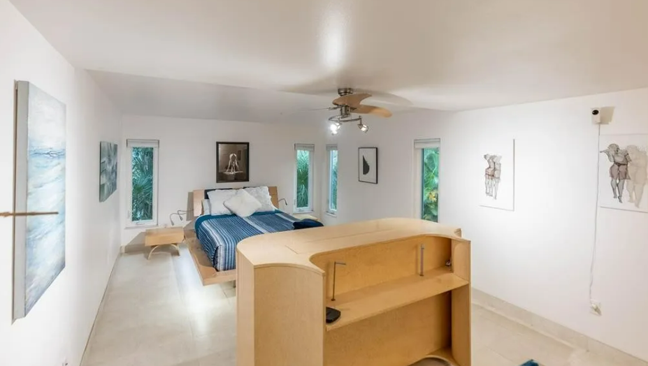 The bedrooms are also full of amenities like custom-made furniture including a tv console that swivels 180 degrees from the office space to the master bedroom portion of the room. The guest bedroom includes custom furniture as well as a custom-built floating bed with hydraulics for storing items under the mattress.