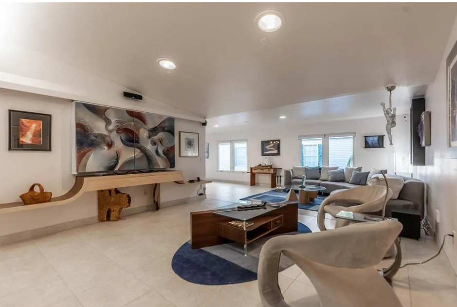 As we move into the interior of the home that’s where the real craftsmanship is on display. Frosted sidelites on both sides of the entry door open up to an exquisite interior featuring artistically crafted premium wood veneers & custom hardwood furnishings throughout. Most of the wood used is bird’s eye maple, cherry, walnut & zebra. The home also has been updated with recessed lighting as well as other modern lighting accents. There’s even an 80′ TV with a/sliding picture panels that close over the TV when not in use.