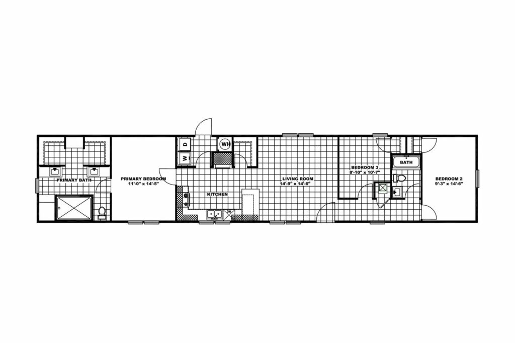Our second home is the Satisfaction manufactured by Clayton Homes. At 1264 square feet this home is priced in the $90,000’s for the basic model, which is a very affordable option for a small family. The home also features a split floor plan with 2 bedrooms on one end and the master bedroom on the other.