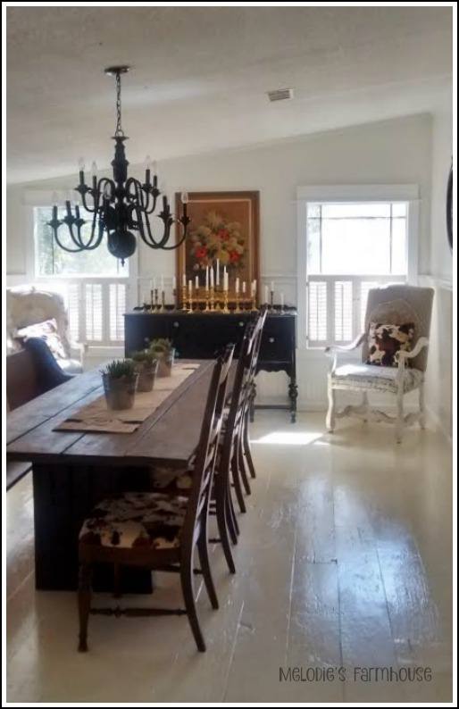 Plywood painted white serves as the floor covering on this modern manufactured home makeover. Geneva, of My Heart’s Song blog, asked Melodie about the choice:
