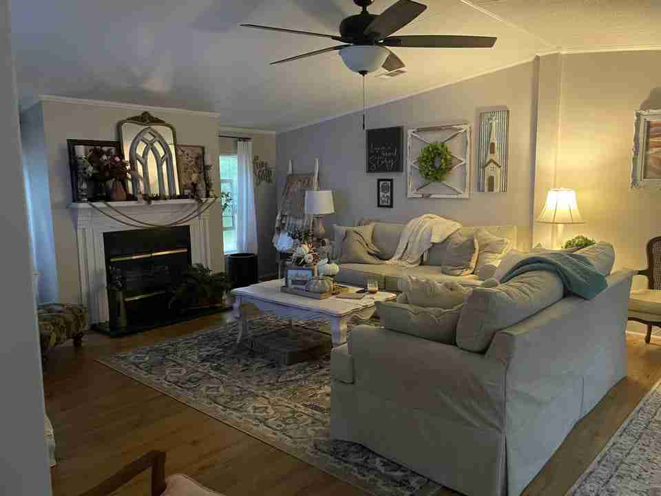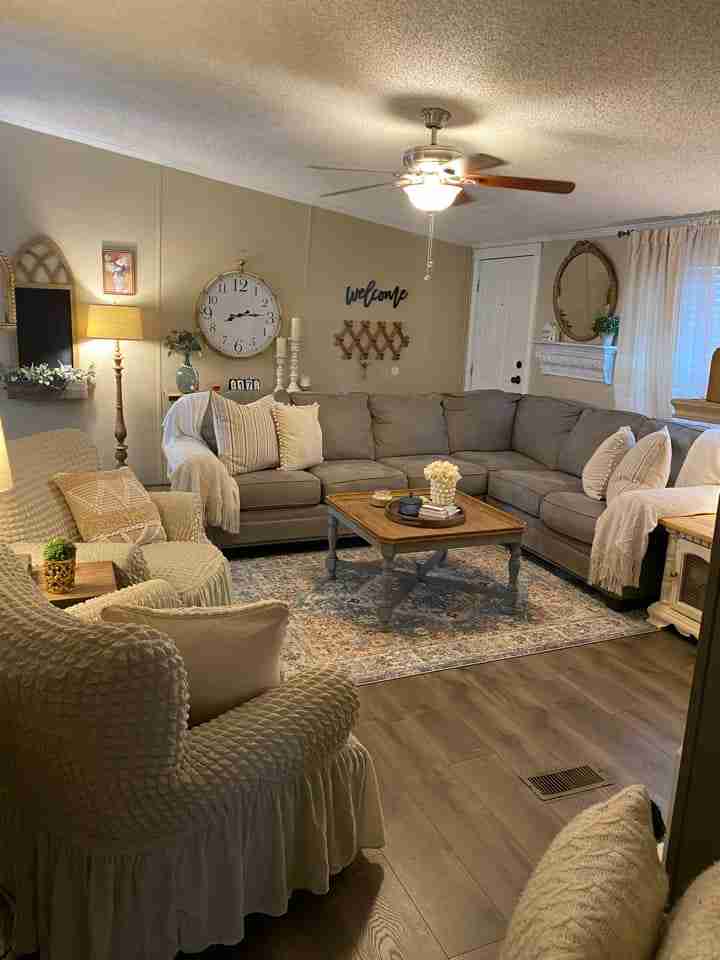 Tammie wasn’t able to share any before pics from her mobile home remodel, however, she gave us some great mobile home remodeling ideas and we love what she did with the space. She pulled the room together nicely with well-placed decor and an area rug to create a cozy and inviting space.