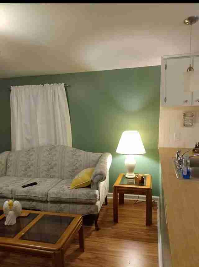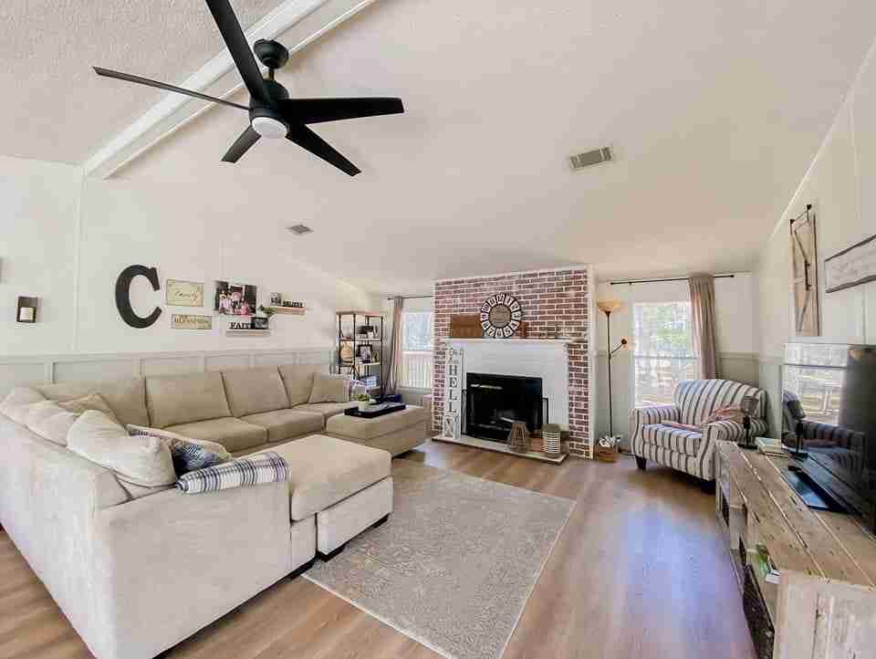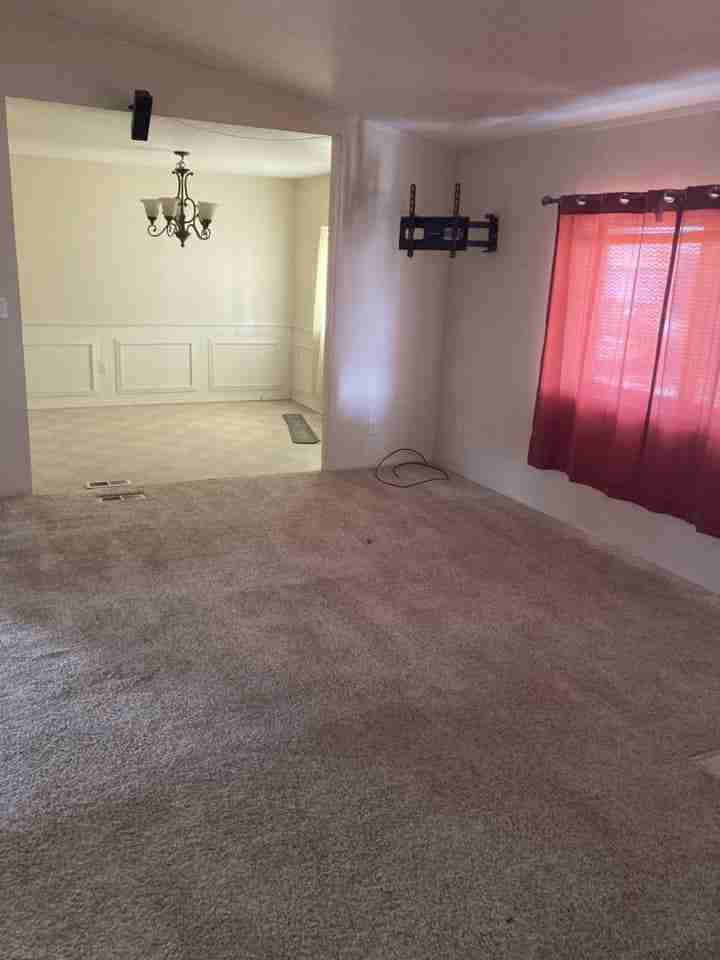 Dee Dee did a great job updating her living room after she purchased the home. Fresh paint that includes a nice accent wall, and an addition of an area rug over the carpet help to complete the look.