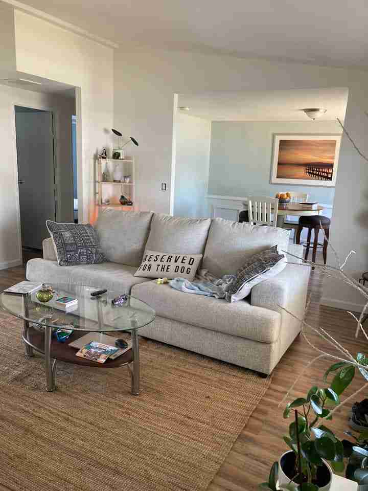 Our member Monica took out the worn carpet in the living room and dining area and replaced it with hardwood/laminate flooring. Fresh paint, an area rug, and some updated furniture and accessories completed the look.