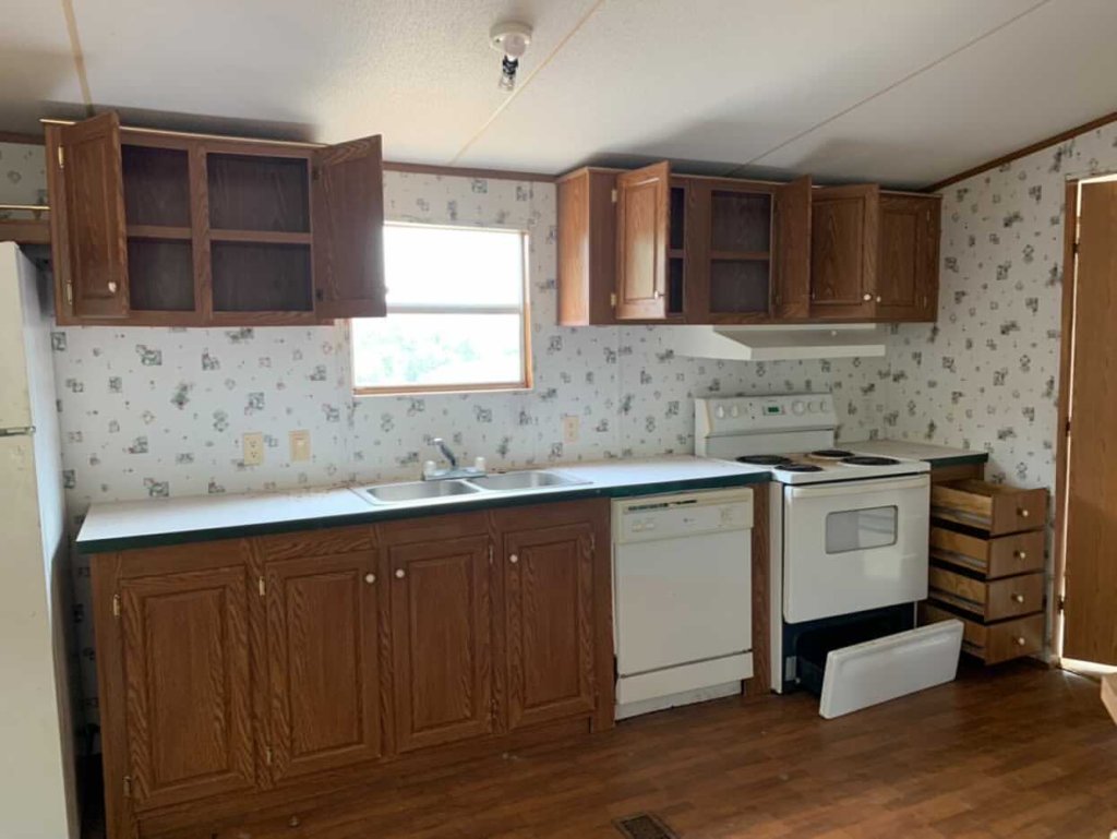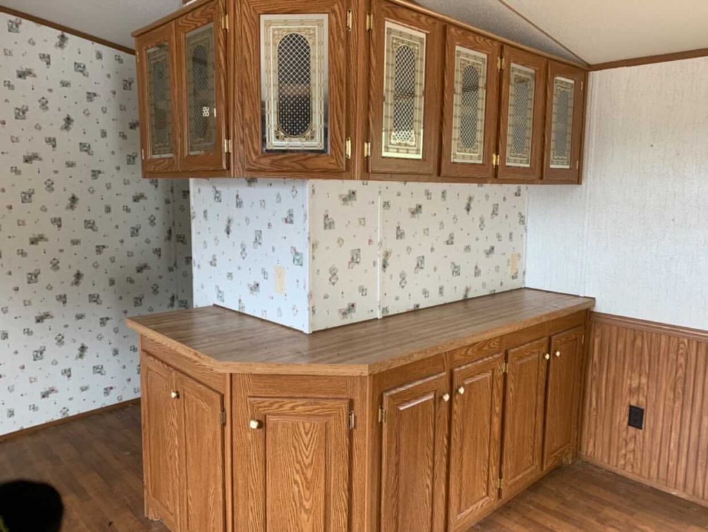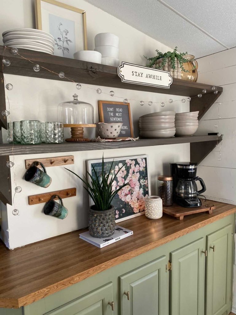 Reclaimed wood from Alexis’s grandfather’s old store was used for the gorgeous shiplap walls of the kitchen in this renovated single wide. The upper cabinets of the built-in were taken down and replaced with open shelving. New countertops and freshly painted cabinets complete the look.