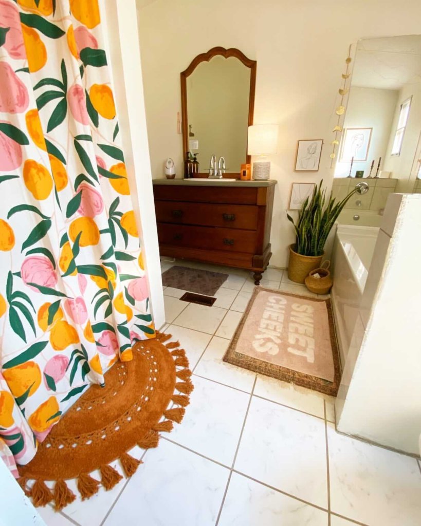 One of the biggest challenges of any remodel is what to do with the bathroom. In Alexis and Andrew’s renovated single wide they decided to tear out the large garden tub and replace it with something smaller. They also repurposed a dresser as a vanity for their sink. Plants and pops of color complete the boho style Alexis was going for.