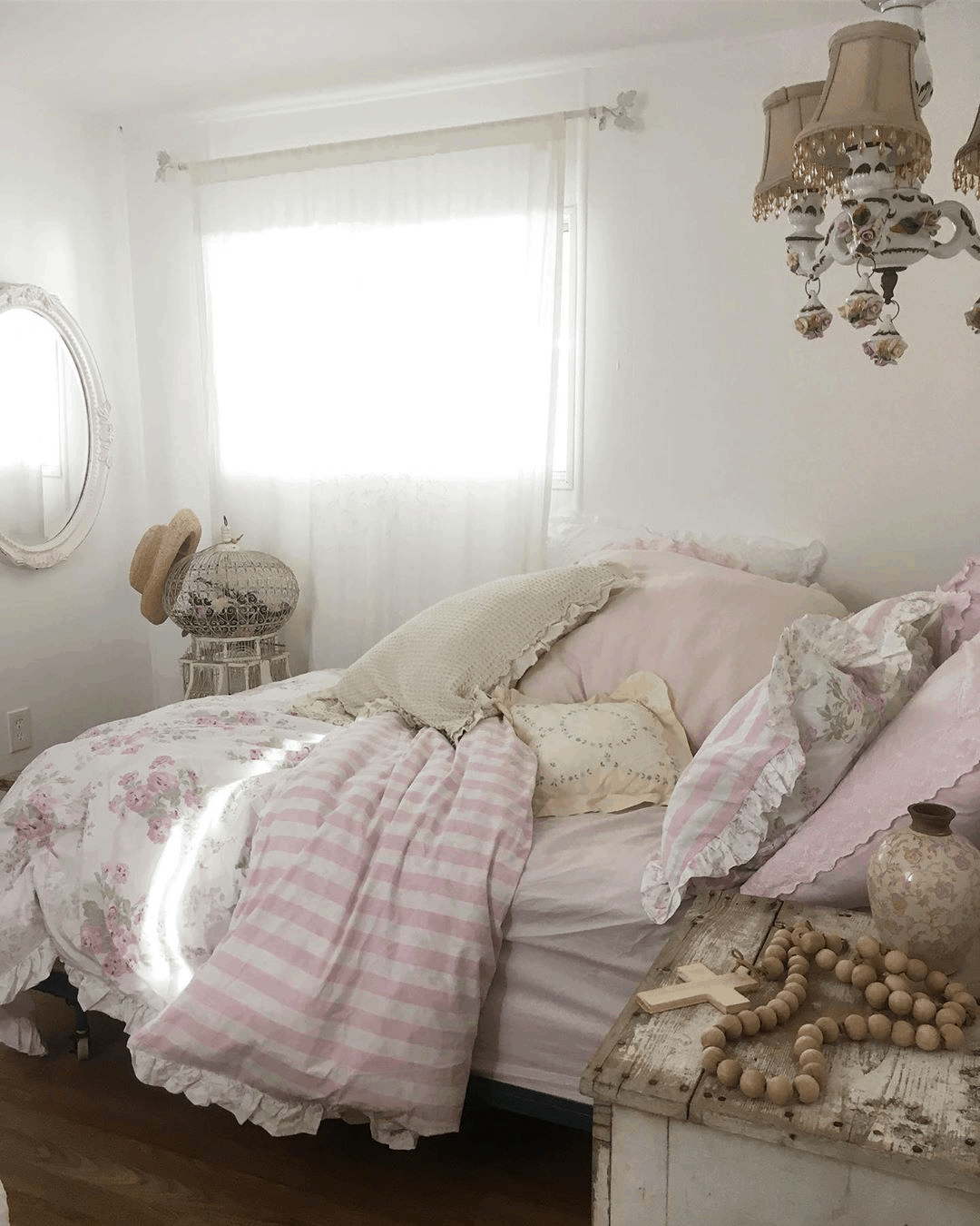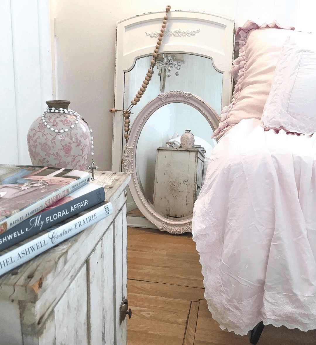 Although a challenge, finding beautiful and original pieces to create her romantic shabby chic look was well worth it. You can always buy shabby chic decor at a retail store but what’s the fun in that? Getting the real deal imperfections at flea markets, second-hand stores, and Goodwill is more fun and much more affordable.