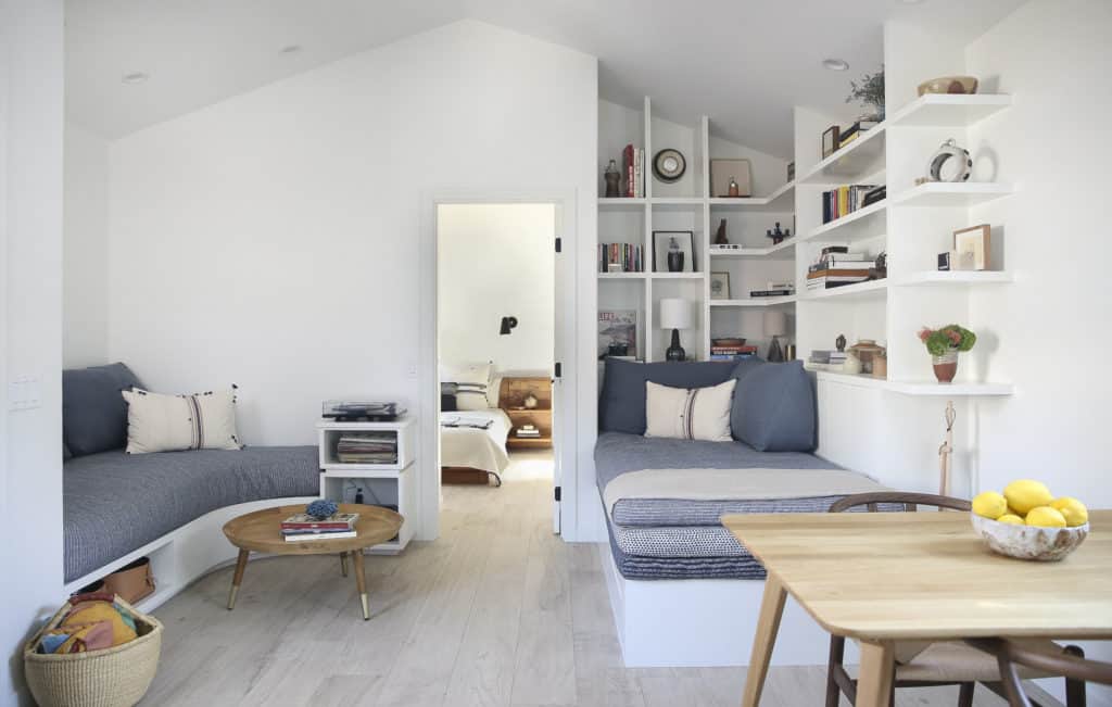 We have to say we absolutely love what the designer and owners accomplished with this small mobile home. It has a minimalist feel while still being welcoming and they made great use of the entire space by adding built-ins and hidden storage spaces.