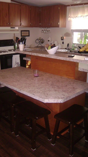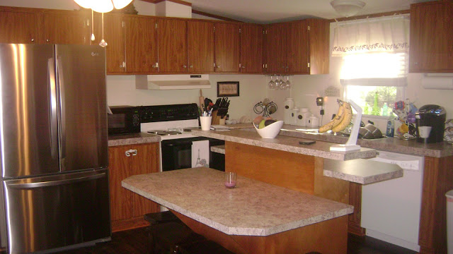 Here is their kitchen, which is where they’ve done the most work, other than the additions. It has went through a few color changes, the sub-flooring near the back door was replaced and they tore out the island bar that separated the living room and kitchen. They also added all new flooring, had a custom island built, replaced the counter tops, replaced the hardware on the cabinets, added a dishwasher, new light fixtures and ceiling fan, added white wooden blinds and purchased all new appliances. It started with a coral color, went to a nice blue and then ended in a neutral tone. It looks great with the huge stainless refrigerator, the tri-level island and the dark flooring!